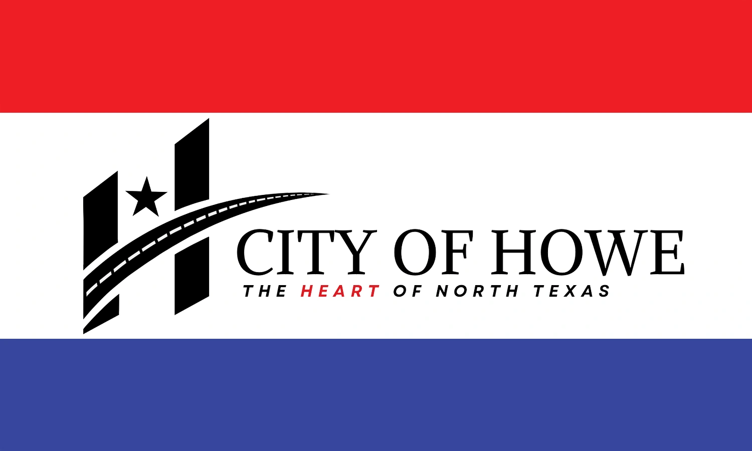 The flag of Howe is a red-white-blue horizontal tricolor, white band twice the width of the others, with the official logo.