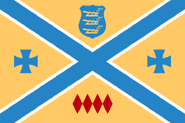 Based on a design by Hans. The flag of English Jersey contains a red saltire on white; the New Jersey flag has a saltire in the state colors of blue and buff. The three buff areas symbolize the three distinct regions of the state: North, Central, and South Jersey. The red triangle alludes to the Phrygian cap as well as the cornucopia, the items held by the supporters of the current arms, representing the state motto, "Liberty and prosperity”. The red triangle bordered by white also abstractly mimics the red and white lozenge in the arms of the original Lord Proprietor of the state Sir George Carteret. Posted by Preston Knapp [1]